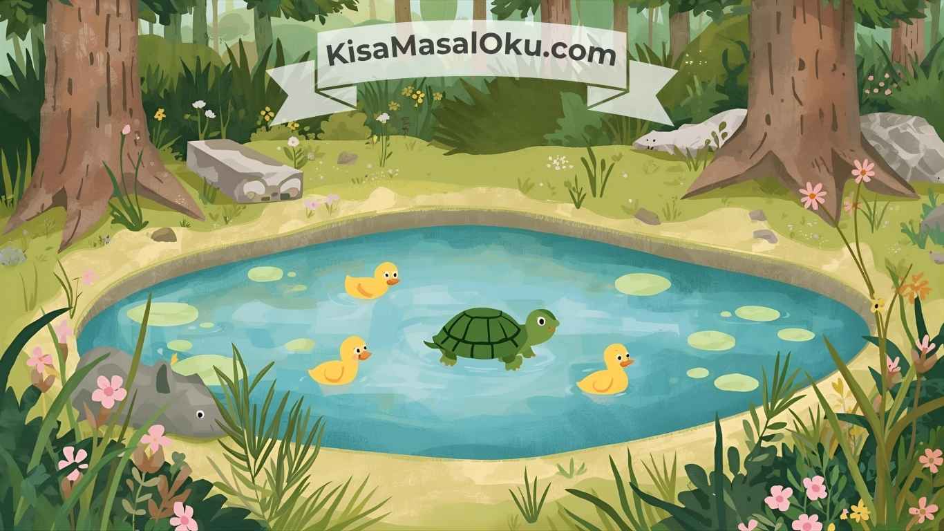 Ormanın derinliklerinde küçük bir gölet varmış. Bu gölette yaşayan su kaplumbağası Lila, her sabah güneşin suyun üzerine düşen ışıklarını izler, minik yaprakların gölette süzülmesini seyredermiş. Bir gün gölette yeni bir sürpriz çıkmış: ufak bir ördek yavrusu, annesini kaybetmiş ve çaresizce suyun kenarında bekliyormuş. Lila hemen yaklaşmış, yavruyu nazikçe sırtına almış ve gölette güvenli bir yere taşımış. Yavru ördek korku içinde titrermiş, ama Lila’nın sıcak bakışları ona cesaret vermiş. Göletteki diğer hayvanlar da birer birer gelmiş ve yavru ördeğe yardımcı olmak istemiş.