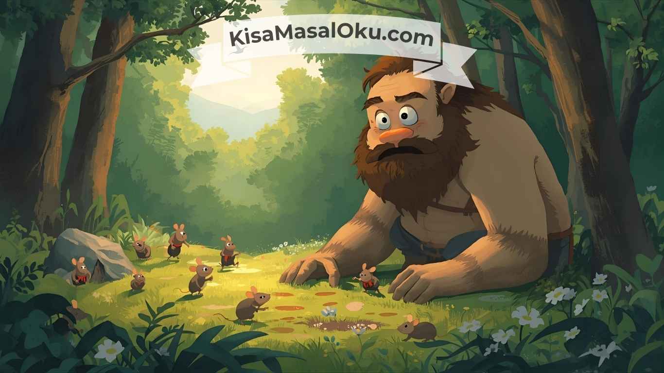 Günlerden bir gün, sabahın erken saatlerinde ormanda büyük bir yangın çıkmış. Kuru otlar alev almış, duman göğe yükselmiş. Hayvanlar korkuyla yuvalarından kaçışmış. Dev, alevleri görünce “Herkesi kurtarmalıyım!” diye koşmuş. Büyük elleriyle ağaç dallarını kırıp hayvanların çıkış yolunu açmış. Ama tam o sırada ayağına devasa bir kütük yuvarlanmış ve devin bacağı sıkışıp kalmış. Ne kadar uğraşsa da kurtulamamış. Yangın yavaş yavaş yaklaşırken ormandaki hayvanlar çaresizlik içinde izliyormuş. Hiç kimse bu kadar büyük birini nasıl kurtaracağını bilmiyormuş. O sırada minicik fareler ortaya çıkmış. Cesur farelerden biri, “Biz birlik olursak başarırız!” demiş. Hemen yüzlerce fare bir araya gelmiş. Kimisi kütüğün altına tüneller açmış, kimisi dalları kemirerek hafifletmiş. Bazıları devin çevresine su taşıyarak ateşi yavaşlatmış. Küçücük bedenleriyle devasa bir iş başarmışlar. Sonunda kütük yuvarlanmış ve dev özgür kalmış. Gözleri dolmuş, minik farelere bakarak, “Siz benim için hayatınızı tehlikeye attınız. Benim yalnız olduğumu bilmeden benden hep korktular, ama siz bana dost oldunuz” demiş. Fareler hep bir ağızdan cevap vermiş: “Önemli olan büyüklük değil, yürektir. Birlik olunca her zorluk aşılır!”